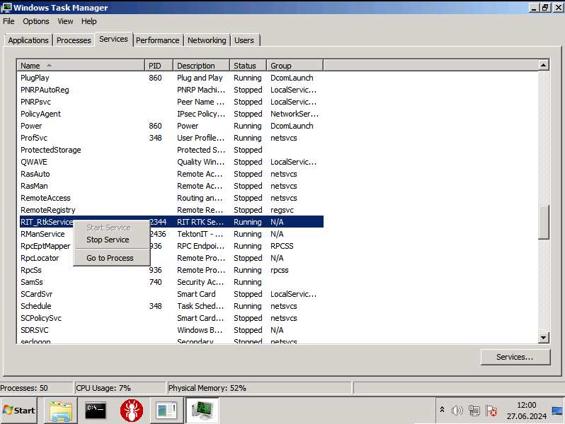 - Открыть список служб и остановить службу RIT_RtkService (варианты для запуска диспетчера задач: ПКМ по панели задач > Start Task Manager или сочетания клавиш Ctrl + Shift + Esc)