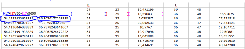 3)Далее из глобальных координат считаются десятичные по формуле Градусы + минуты / 60 + секунды / 3600
