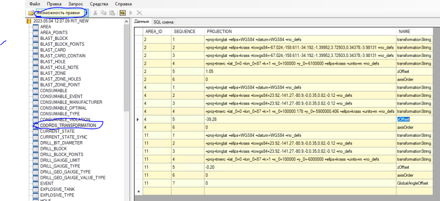 В открывшемся окне выбираем «Возможность правки» (Левый верхний угол) и открываем табличку Coords Transformation или Coords PROJ Transformation.
